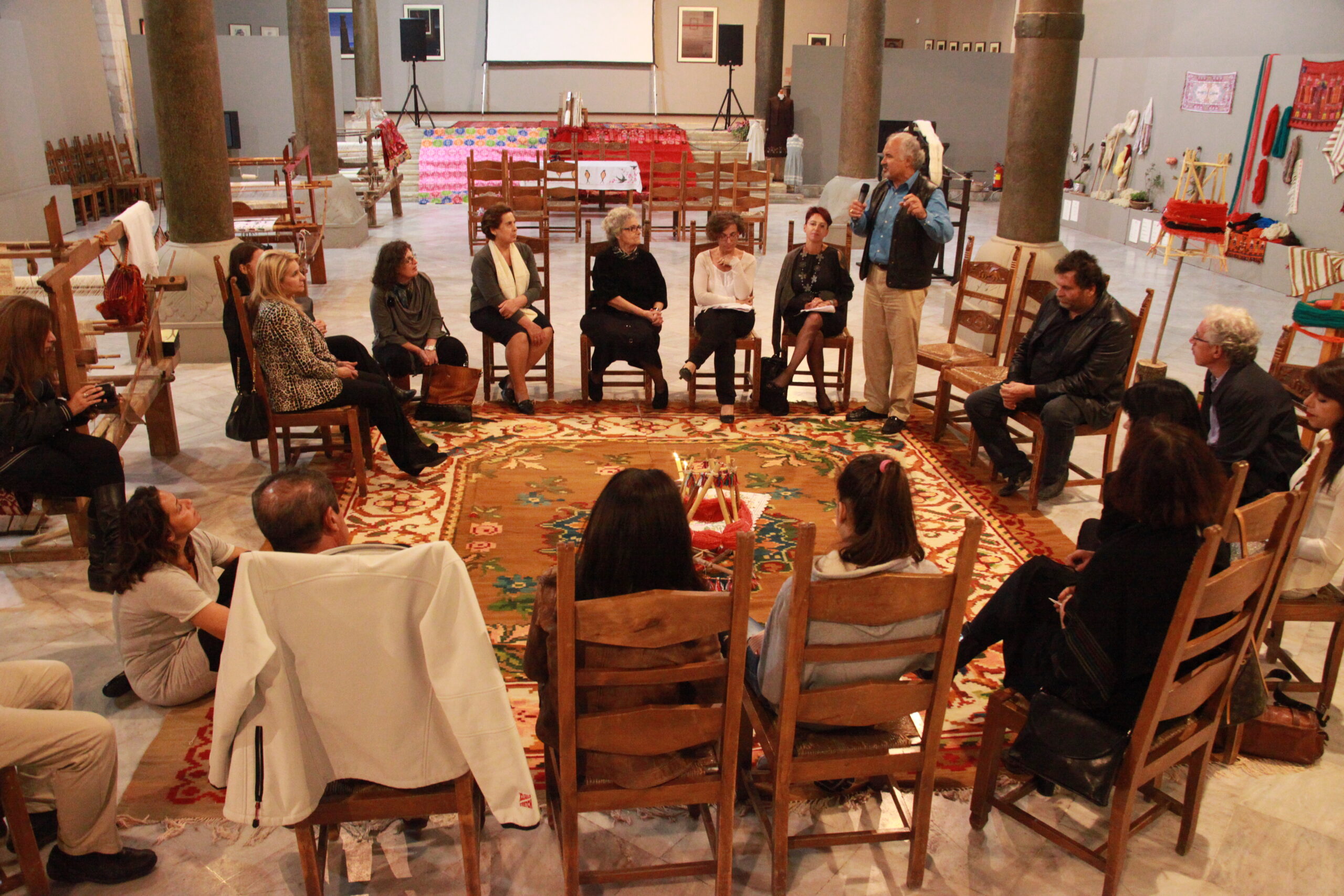 H πρώτη δράση πραγματοποιήθηκε την 1η Νοεμβρίου 2012, με μια δεκαπενθήμερη Έκθεση-Διάδραση, στη Βασιλική του Αγίου Μάρκου στο Ηράκλειο. Στο πλαίσιο της Έκθεσης, λειτούργησαν τέσσερα αργαλειά, από τους τέσσερις νομούς της Κρήτης με λαϊκές υφάντριες, που ερμήνευαν με τρόπο κανονικό την τέχνη του αργαστηριού. Τη διαδικασία από το καθαρό χωράφι, στο καθαρό πρόβατο, στη δημιουργία του νήματος που είναι φυσικό, το βαμβάκι, το μαλλί, το μετάξι και το λινάρι, βαμμένα με χρώματα από τη φύση. Να μας ορμηνέψουν για το χρόνο που δεν είναι χρήμα, δεν μετριέται με εργατοώρες αλλά είναι συθέμελα το είναι τους, η αναπνοή, η σκέψη, η μοίρα και το μοιρολόι, το τραγούδι μαζί με τη δόξα και τη δοξασία.