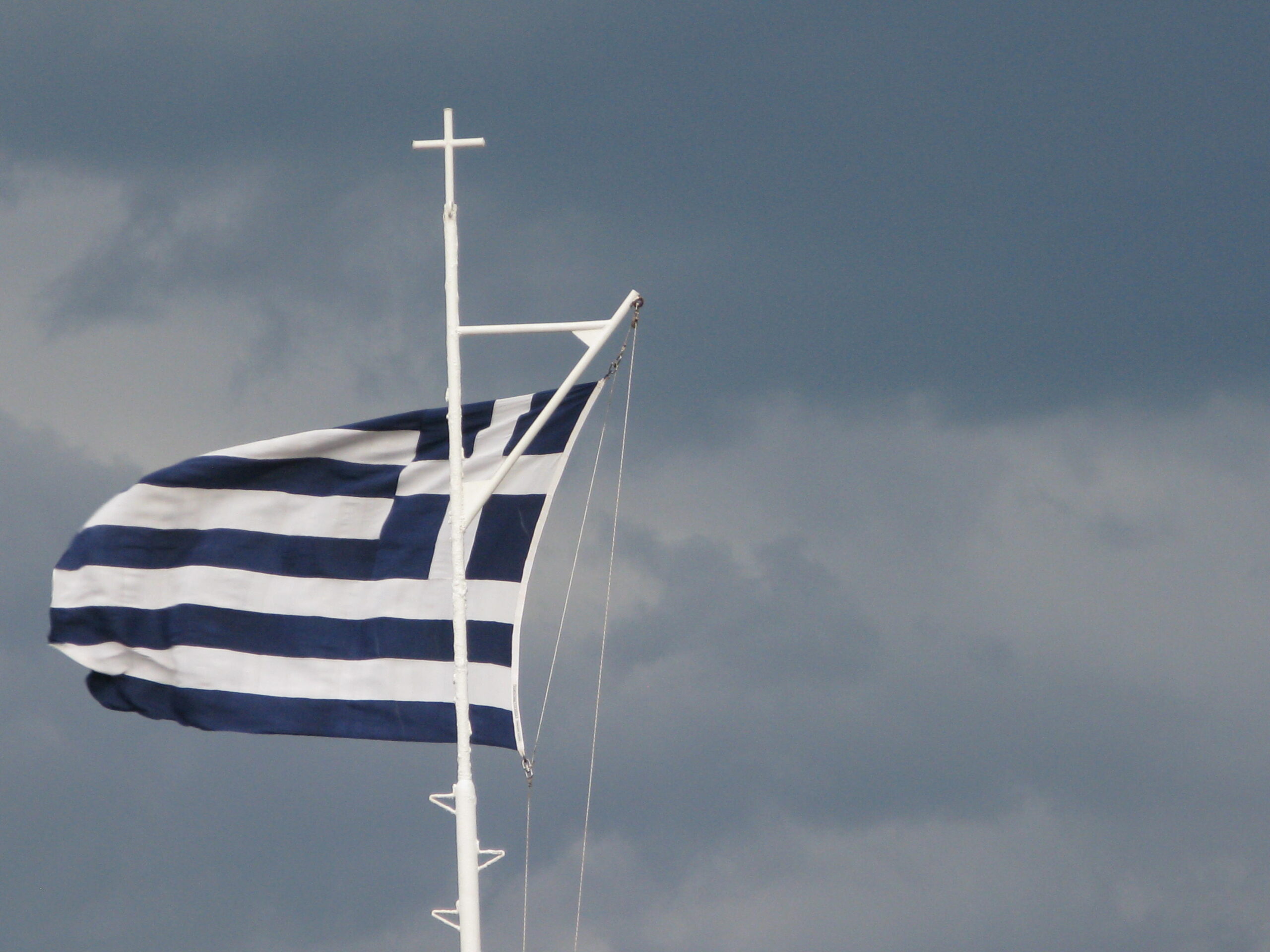 The Greek flag, woven with natural silk by weavers-members of the Penelope Gandhi Mission, is raised on December 1, 2013, at Firkas Fortress in Chania, for the 100th anniversary of the Union.